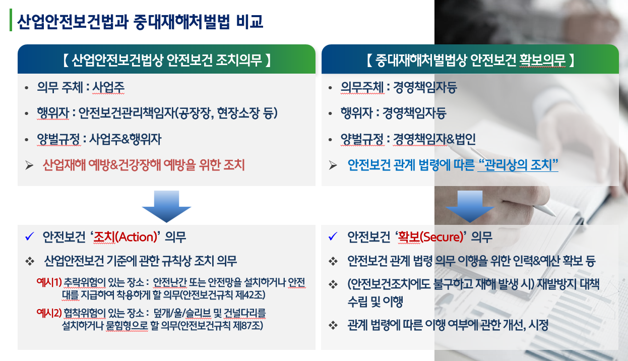 핵심은 산업안전보건법은 “일상적인 관리책임”을 강조하는 반면,